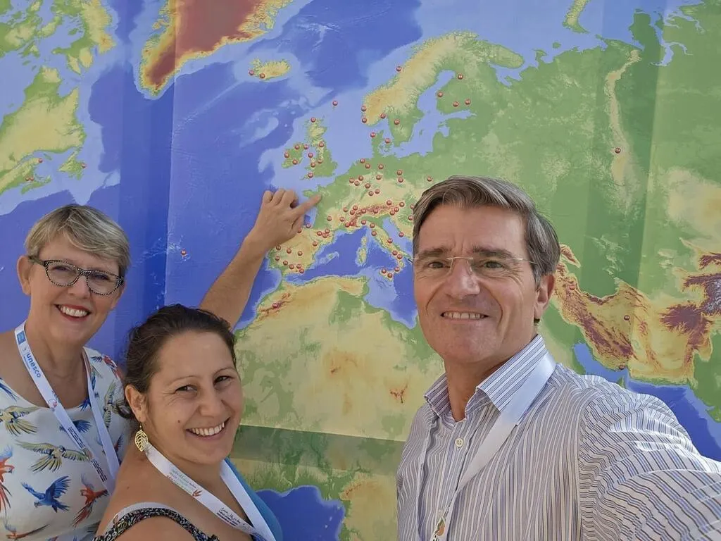 Christelle Aurégan, vice-présidente du parc naturel régional Normandie – Maine, Mélanie Massias, directrice adjointe en charge du géoparc et Laurent Marting, le président, devant la carte des géoparcs mondiaux Unesco. Un nouveau point va bientôt être ajouté en Normandie ! © PNR Normandie – Maine