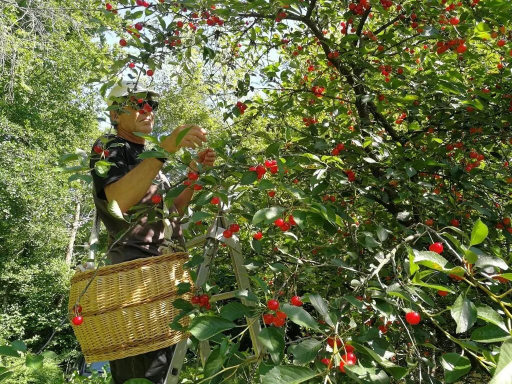 Charmotte sur l’épaule, grimpé sur un escabeau, le gourmet procède à la cueillette des griottes. © Ouest-France