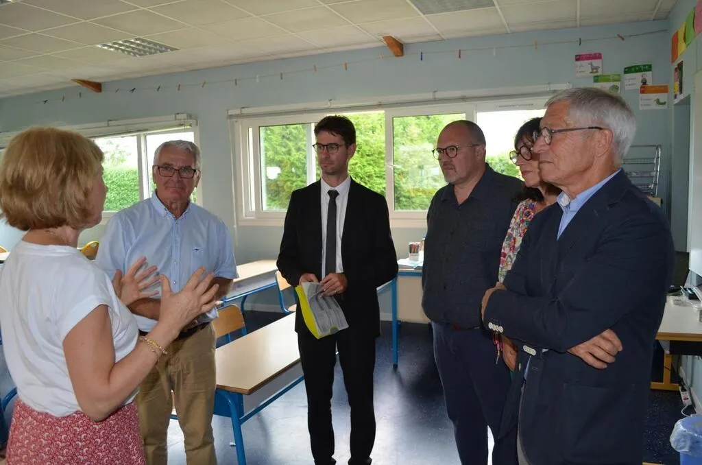 En présence de l’inspecteur de l’Éducation nationale, lundi, une visite des écoles a été organisée avec Jean Sellier, président de la communauté de communes et les maires. © Ouest-France