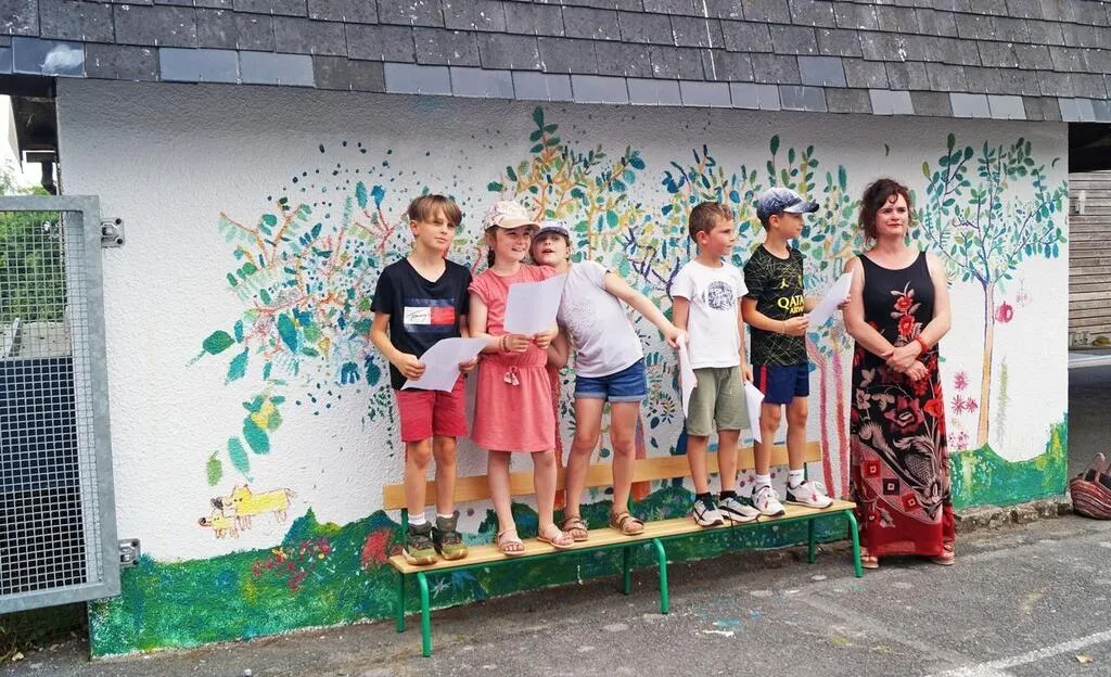Quelques enfants accompagnés de Marion Alexandre ont pris la parole pour expliquer aux personnes présentes le cheminement pour la réalisation de cette fresque. © Ouest-France