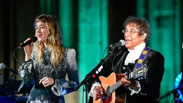 Laurent Voulzy avec la chanteuse-harpiste Naomi Greene, en concert au Mont-Saint-Michel. © JULIEN ZANNONI