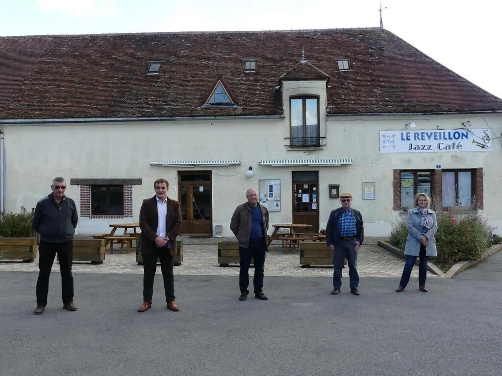 Gilles Armand, sous-préfet et les élus de Réveillon devant le Jazz café « le Réveillon ». © Ouest-France