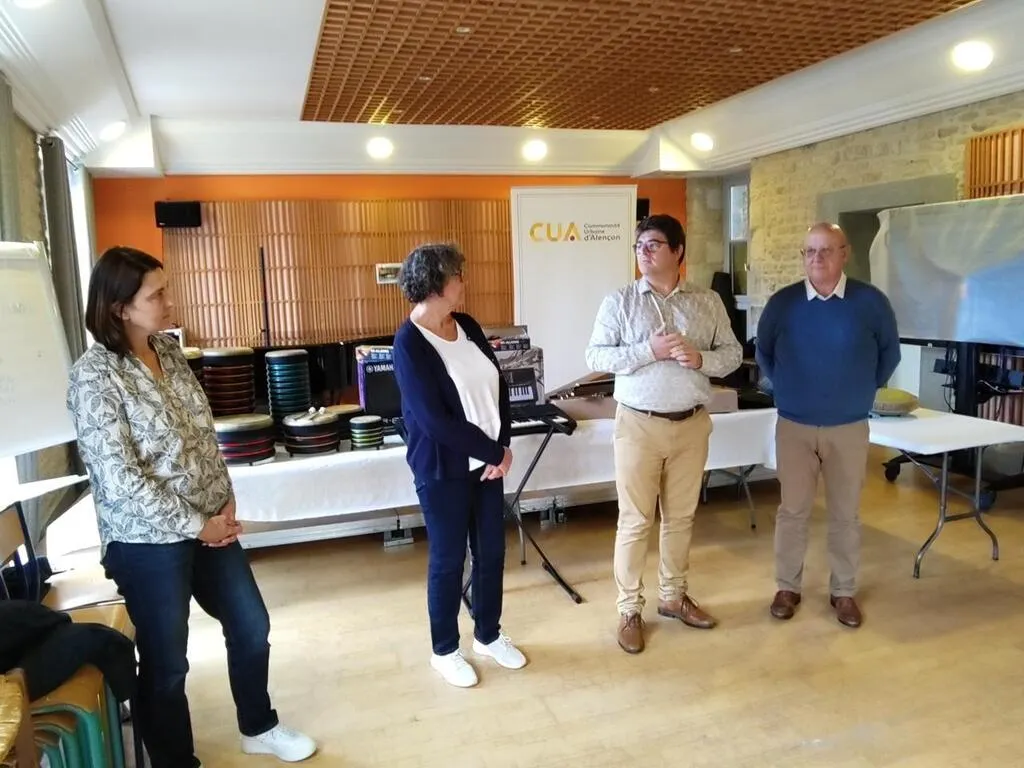 De gauche à droite : Pauline Mardelle, référente Musique et handicap ; Fabienne Mauger, maire adjointe aux affaires culturelles ; Sébastien Raulet, ancien président du Rotary club d’Alençon et Xavier Vanhooland, directeur du conservatoire, devant les instruments offerts. © Ouest-France