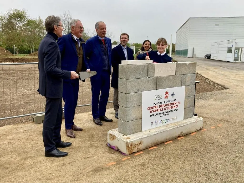 La première pierre du Centre d’appels d’urgence de l’Orne (CDAU 61) a été posée mercredi 6 novembre 2024 par la directrice du Sdis, devant le directeur général de l’ARS de Normandie, le préfet de l’Orne et le président de conseil départemental. © Ouest-France