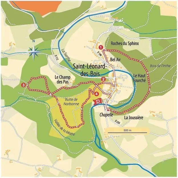 Départ : du parking, traversez et prenez le chemin qui monte à gauche de la chapelle. Montez tout droit jusqu’au bois de l’Inthe. En haut, continuez à gauche et suivez le sentier qui domine Saint-Léonard-des-bois. Plus loin, vous redescendez à travers bois.