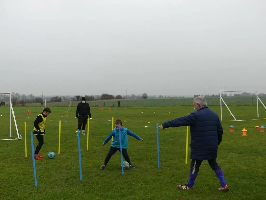Philippe Geffroy et Stéphanie Goret dispensent leurs conseils aux jeunes joueurs de l’école de football lors d’un exercice de dribbles. © Ouest-France