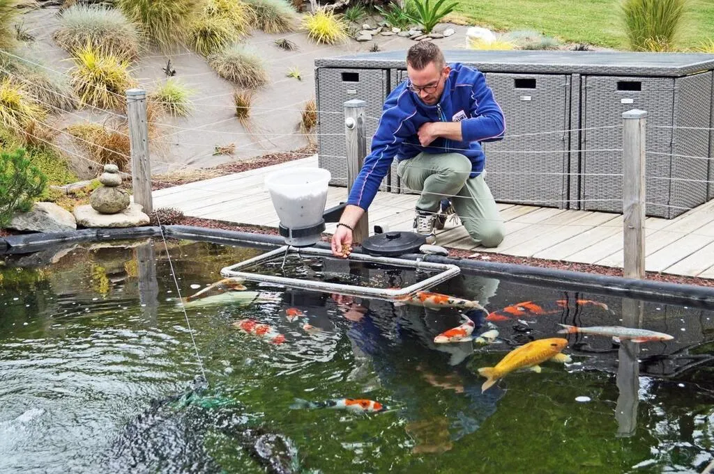 Quand il le peut, il nourrit lui-même ses carpes koï. Certaines viennent manger dans sa main et il les caresse. © Ouest-France
