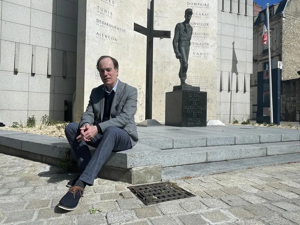 Christophe Bayard devant le monument érigé en mémoire du général Leclerc, à Alençon. © Ouest-France