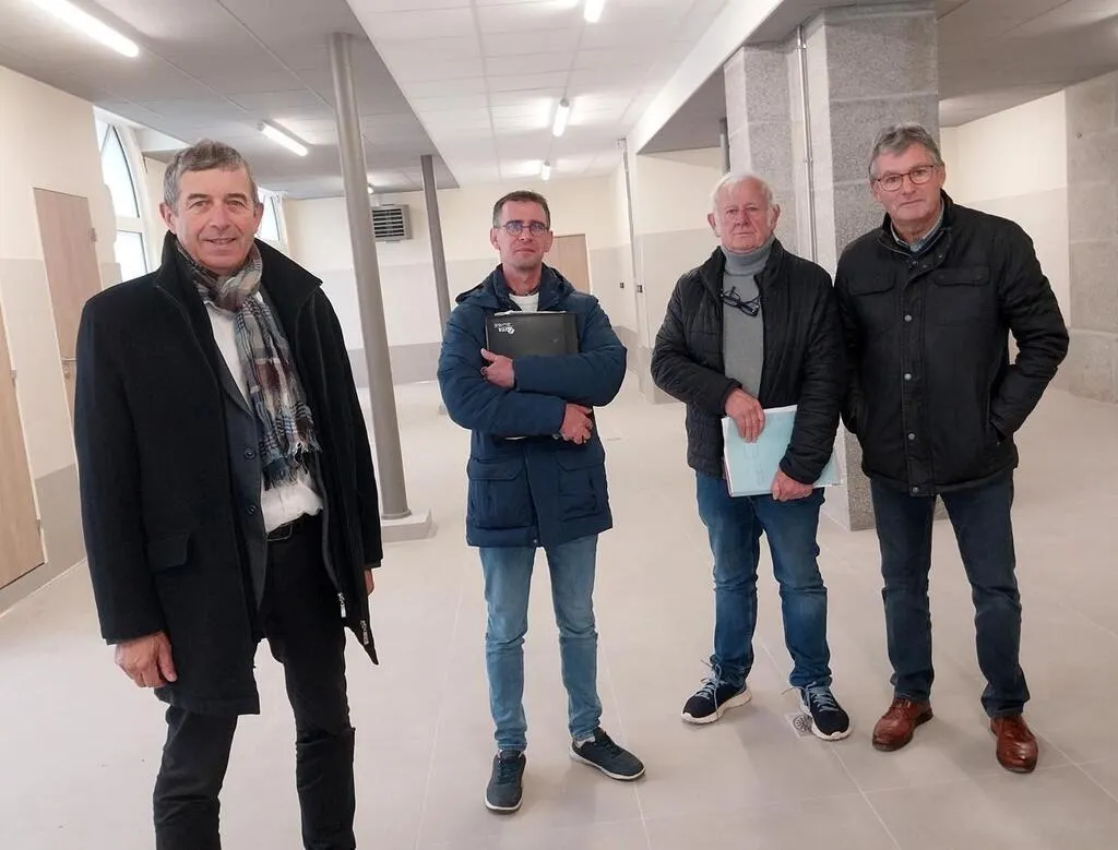 De gauche à droite : Michel Leroyer, maire ; Benjamin Berny, agent chargé des bâtiments ; Roland Foucher, adjoint chargé du cadre de vie et Rémi Dujarrier, conseiller délégué à l’habitat, lors de la visite de la fin des travaux du marché couvert. © Ouest-France