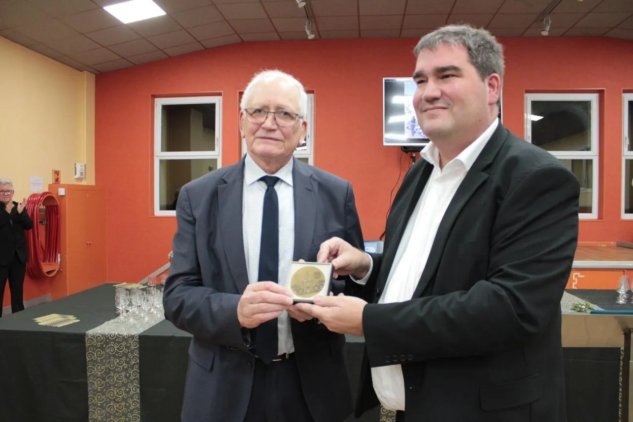 Le maire, Jacques Prigent, à gauche, a reçu, des mains du sénateur Olivier Bitz, une médaille de reconnaissance du Sénat. © Ouest-France