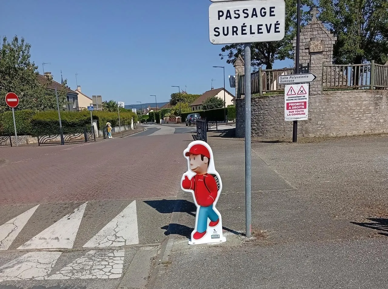 Arthur, figurine d’écolier, et au loin Zoé, incitaient à lever le pied. © Laureen Vandevyvere