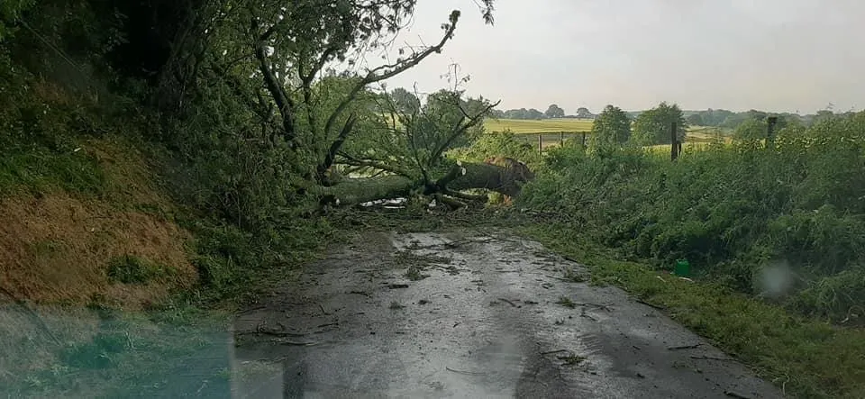 Un arbre couché sur la route à Degré, en Sarthe, suite à l'orage qui a eu lieu dans la nuit de mercredi 16 à jeudi 17 juin 2021. DR