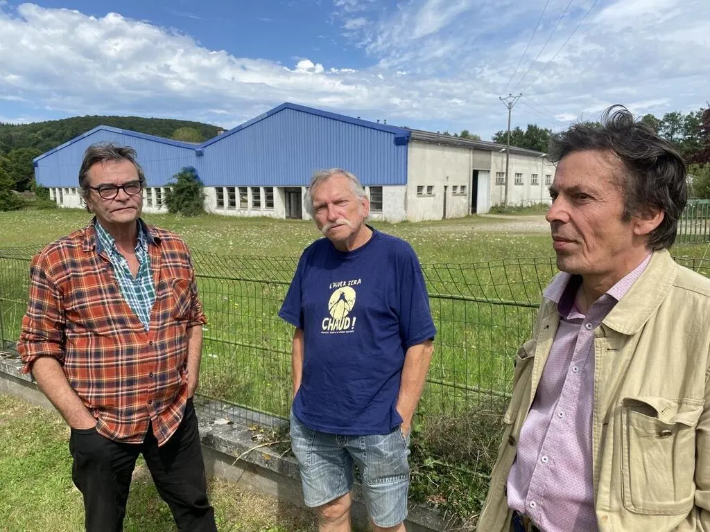Denis Robert, le comédien ; Patrice Schweizer, le syndicaliste, et Jean-Baptiste Evette, le metteur en scène, devant l’entreprise Selimex, ancienne usine Piron. © Ouest-France