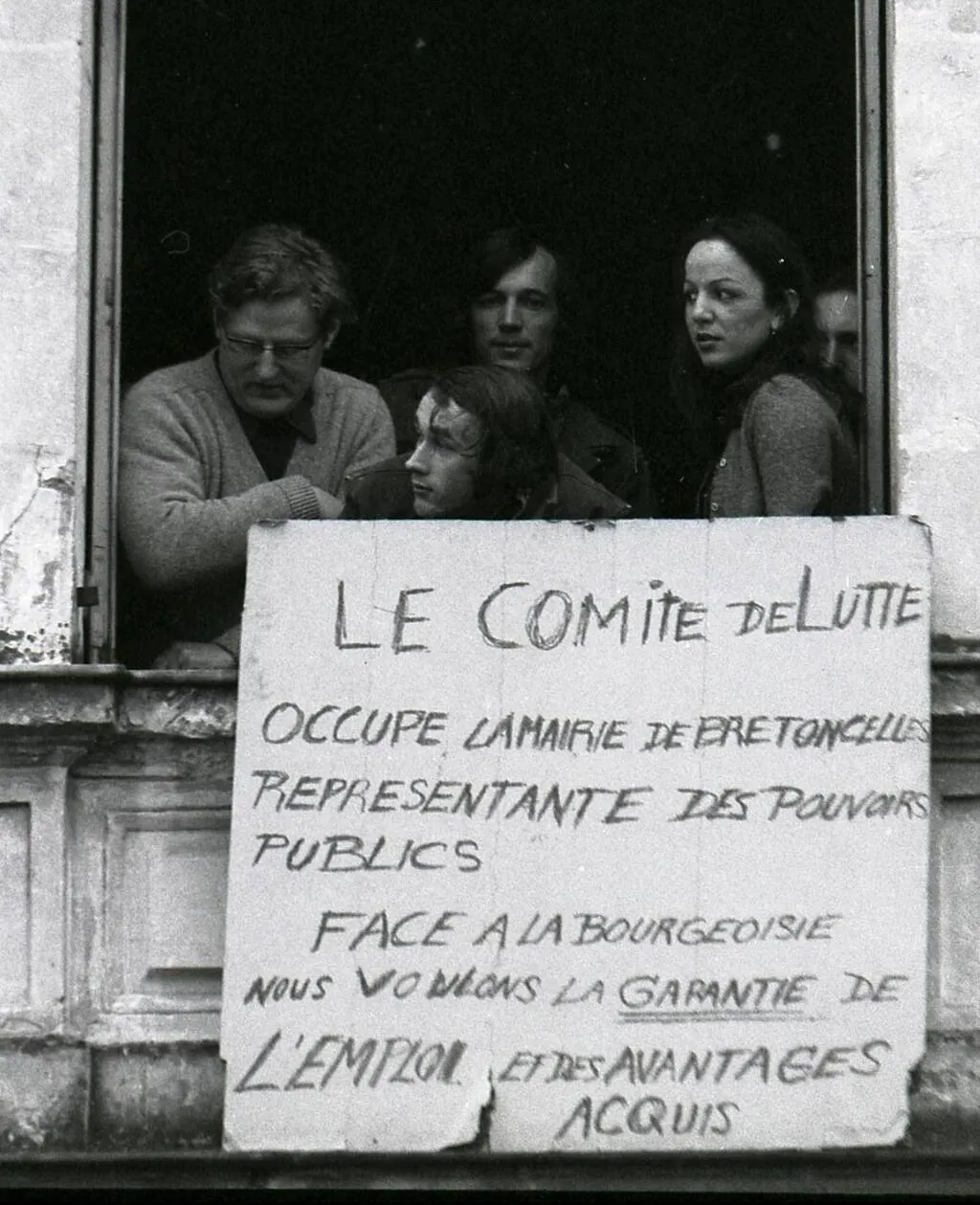 Des travailleurs durant l’occupation de la mairie de Bretoncelles, en janvier 1975. Archives Ouest-France