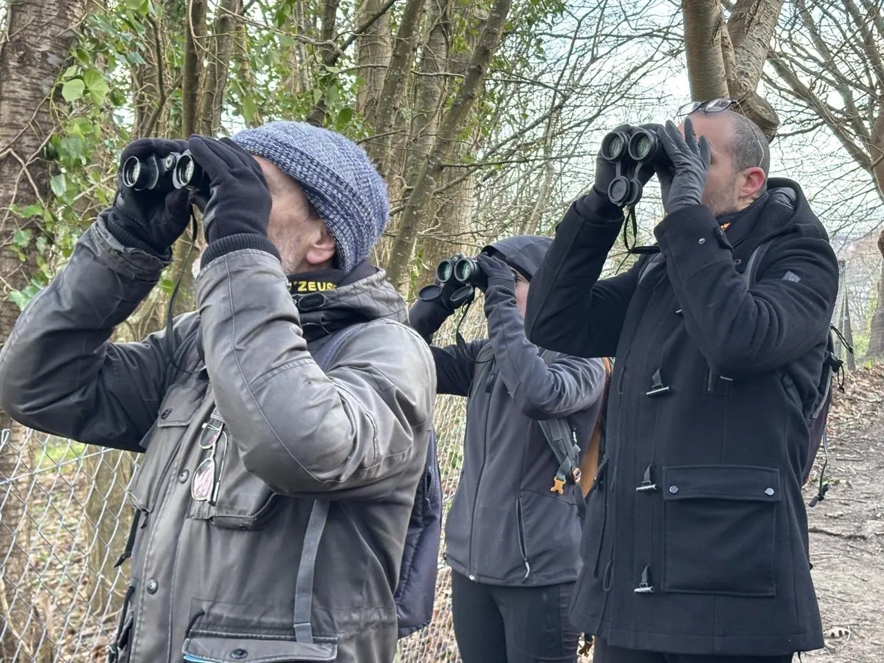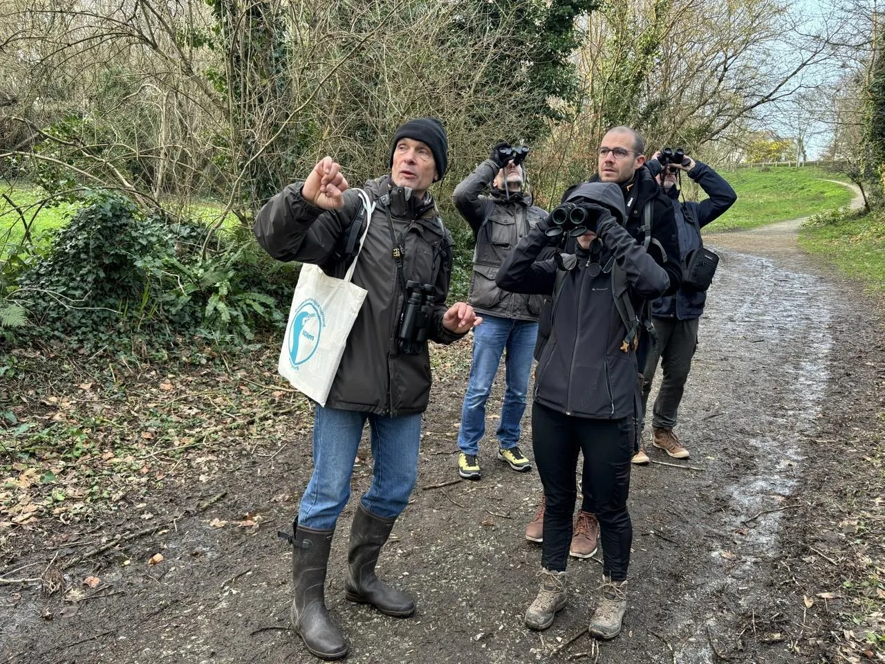 Pendant deux heures, ce samedi 24 janvier 2026 au matin, Éric Gruet, du GONm, a guidé quelques passionnés à la découverte des oiseaux du vallon des Roquettes à Cherbourg. © Ouest-France