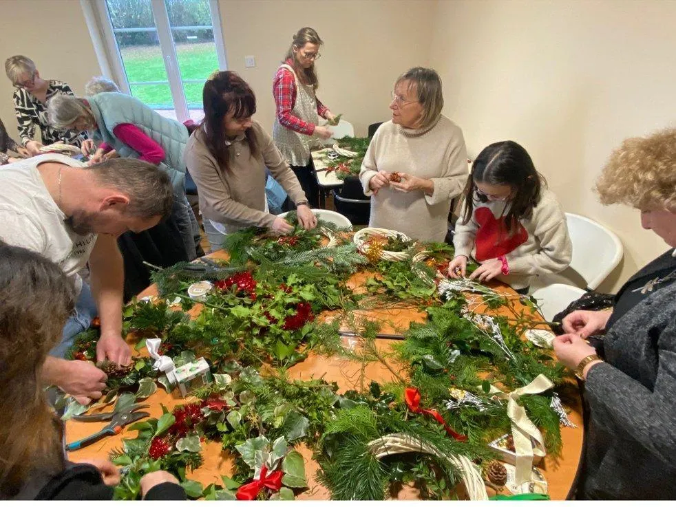 Une vingtaine de personnes à l’atelier de fabrication de couronnes de Noël, au tiers-lieu de Mont-Ormel. © Ouest-France