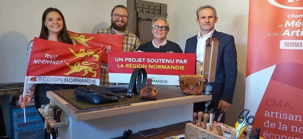 De gauche à droite : Alice et Yoan Degrenier, Brigitte Choquet, conseillère régionale, et Bruno Balloche, président de la CMA Normandie Orne, dans l’atelier de maroquinerie. © Ouest-France