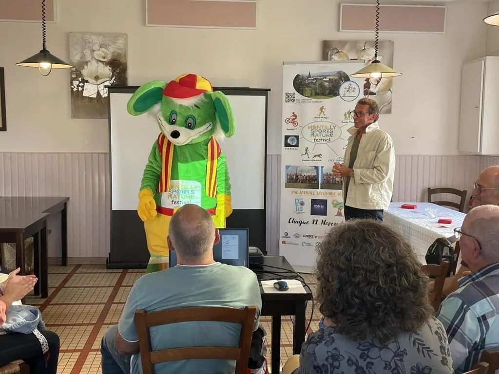 La mascotte Speedy et Hervé Quettier, lors de la présentation de l’édition 2023 du Montilly sports nature festival. © Ouest-France