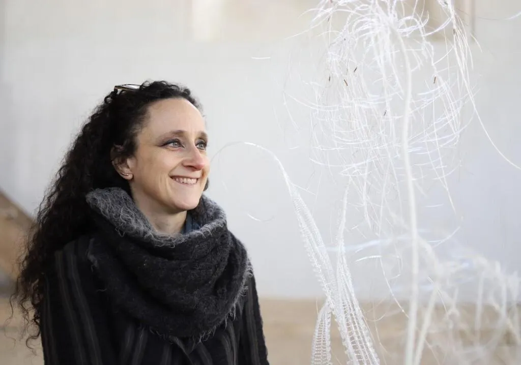 « J’élabore des sculptures faites de fil nylon, précise-t-elle. L’aiguille, mes mains, mon âme sont des pinceaux, le fil en est la trace. »