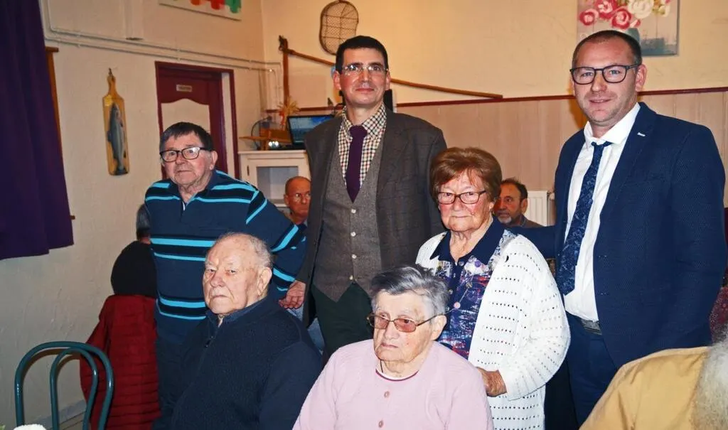 Assis : Camille Poulain, 90 ans et Paulette Blais, 92 ans. Au second plan : Claude Gautier, 77 ans et Andrée Voivenel, 93 ans, en compagnie de Maxime Guilmin, maire de Montsecret-Clairefougère et Julien Salliot : maire délégué de Clairefougère. © Ouest-France