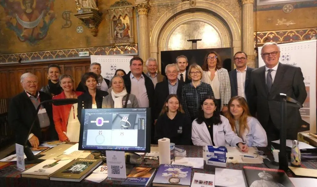 Élus et invités derrière les trois jeunes filles de la Haute école de joaillerie de Paris. © Ouest-France