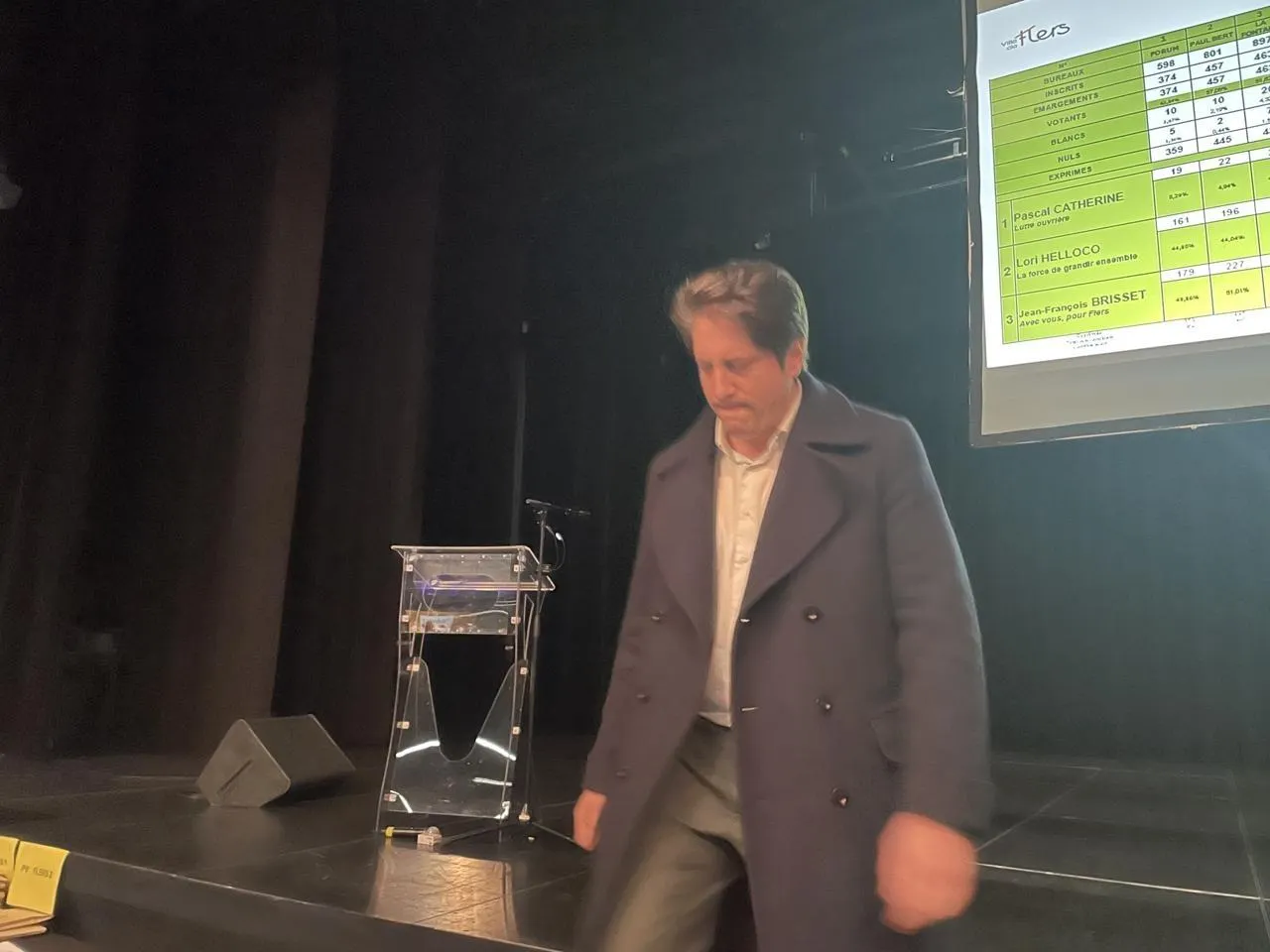 photo  armelline salliot, yves goasdoué, maire sortant de flers, dans l’orne, annonce la victoire à jean-françois brisset, le nouveau maire de flers.  ©  ouest-france 3