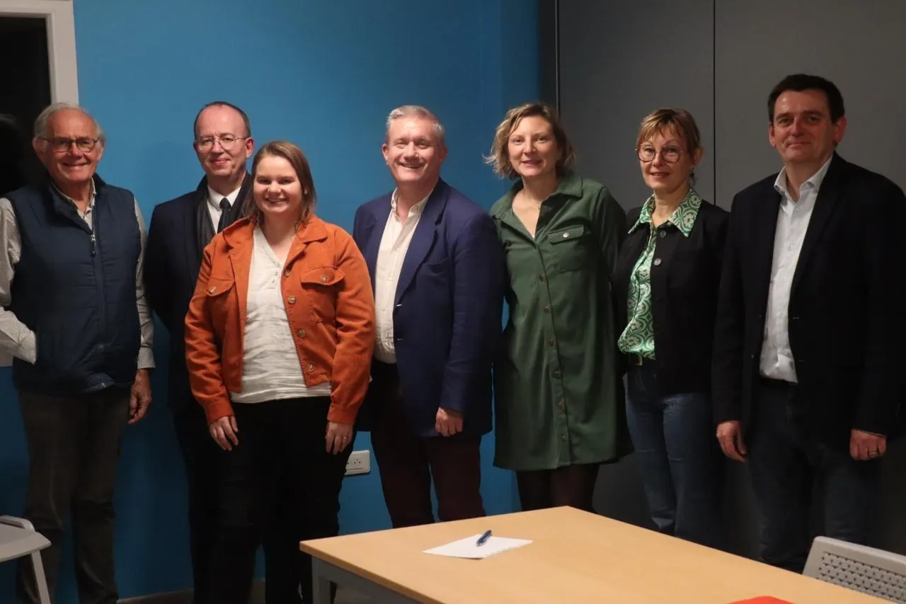De gauche à droite : Philippe Jidouard (adjoint au maire), Christophe Alligné (conseiller municipal dans la minorité), Manon Belgrand (nouvelle colistière), Frédéric Leveillé (maire), Hélène Jolivet (nouvelle colistière), Clothilde Michel (adjoint au maire) et Hervé Lasne (adjoint au maire). Tous seront sur la liste municipale menée par l’édile sortant pour les élections en 2026. © Ouest-France