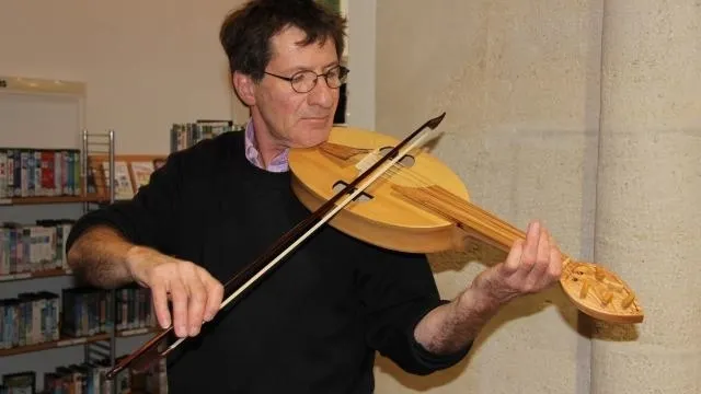 Georges Beucher présente son dernier né : une vièle à archet, à cinq cordes. Il travaille à la médiathèque depuis treize ans, rayon musique bien sûr, car il est l’un des rares fabricants d’instruments de musique médiévaux.