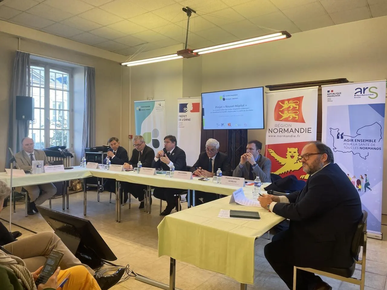 Frédéric Beauchef, maire de Mamers, Joaquim Pueyo, maire d’Alençon, Patrick Faugerolas, directeur du Chicam, Hervé Tourmente, préfet de l’Orne, Hervé Morin, président de la région Normandie, François Mengin-Lecreulx, directeur général de l’agence régionale de santé (ARS) et Bertrand Caillaud, directeur du développement de la clinique LNA Santé ont présenté le projet de nouvel hôpital à Alençon. © Ouest-France