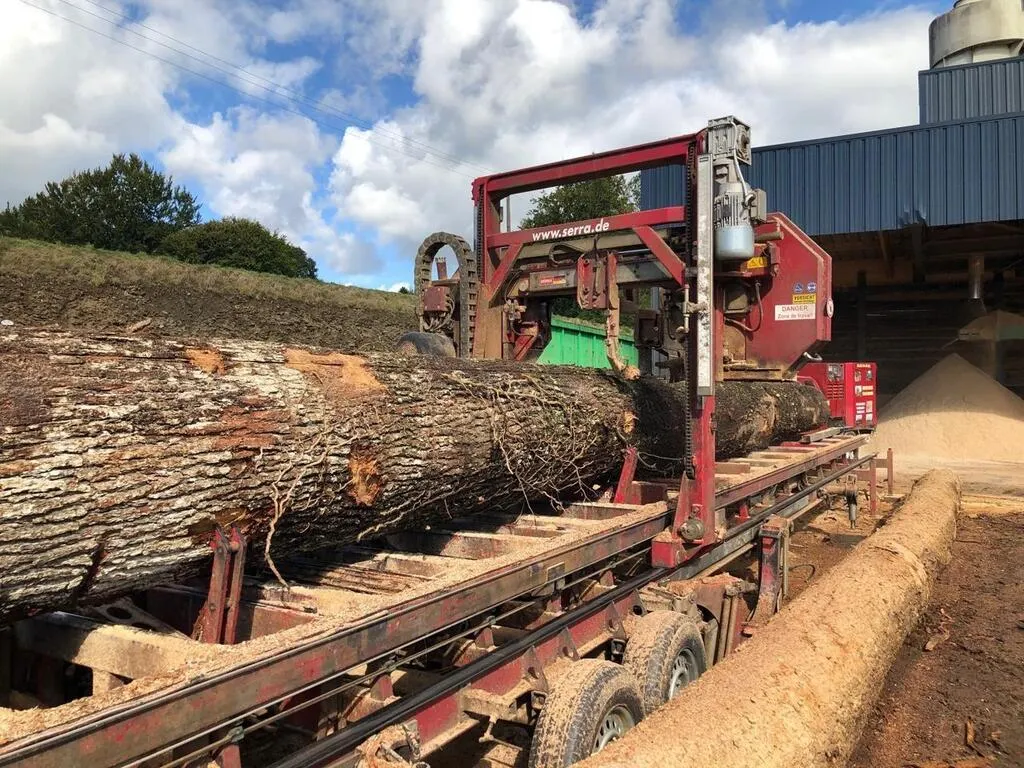 Pour découper ces grumes, longues de 13 mètres, l’entreprise Feillet à Tinchebray-Bocage, dans l’Orne, a dû faire appel à une scierie mobile. Les poutres serviront à la reconstruction de la flèche de Notre-Dame-de-Paris.