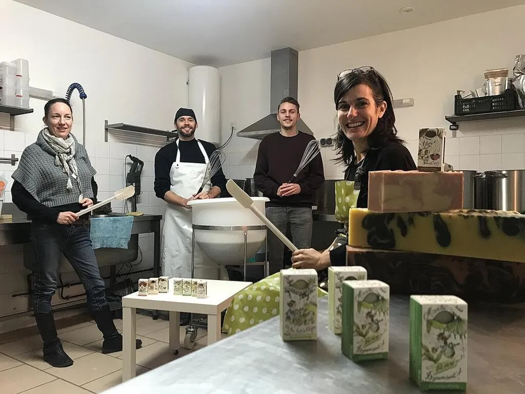 À la savonnerie artisanale bio Les Savons d’Orely, à Vaudeloges (Calvados), Anaïs, Jérôme Vernaudon, Hadrien et Aurélie Vernaudon, fondatrice de la marque et de l’entreprise (de gauche à droite). © Ouest-France