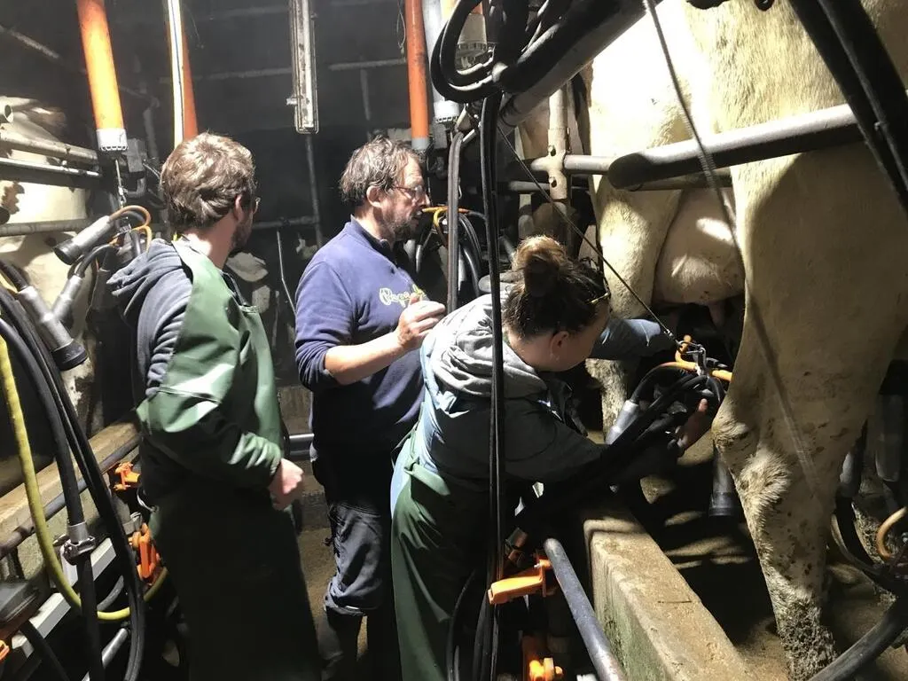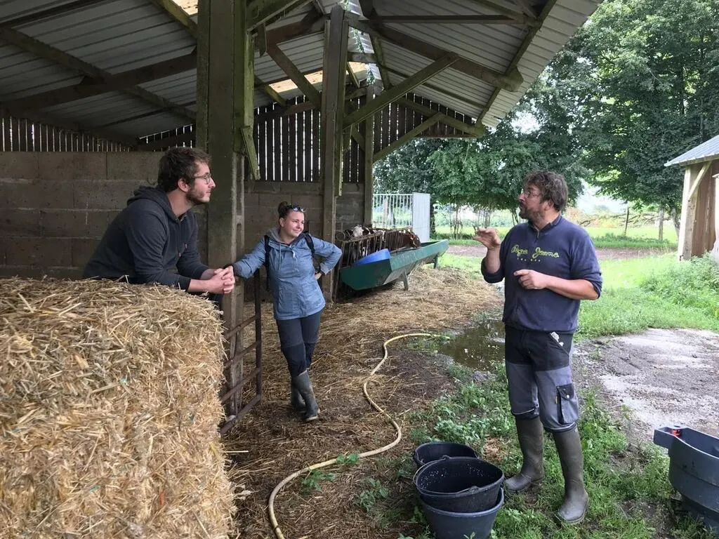 Emma, ancienne éducatrice spécialisée est en cours de reconversion dans le domaine agricole ; Gabriel, ingénieur dans le transport maritime, se questionne. Pour en savoir plus sur le métier d’agriculteur, ils ont passé la matinée lors de la traite des vaches avec Patrice Mesnil, agriculteur en bio à Beauvain (Orne), dans le cadre du camp Alterfixe.