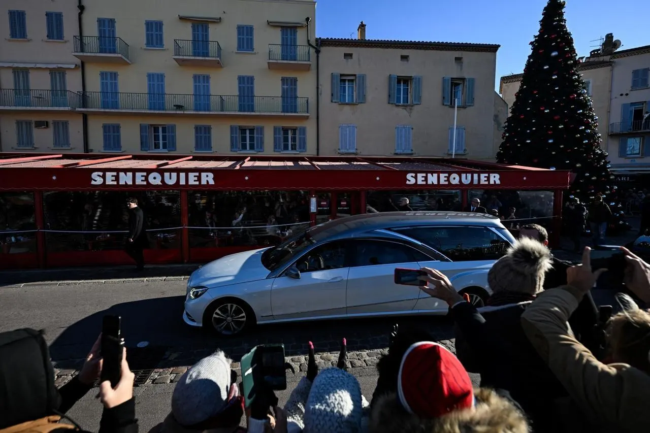 Des porteurs transportent le cercueil devant l'église Notre-Dame de l'Assomption, à la fin de la cérémonie funéraire de la défunte actrice française Brigitte Bardot, à Saint-Tropez, dans le sud-est de la France, le 7 janvier 2026. © VALERY HACHE / AFP