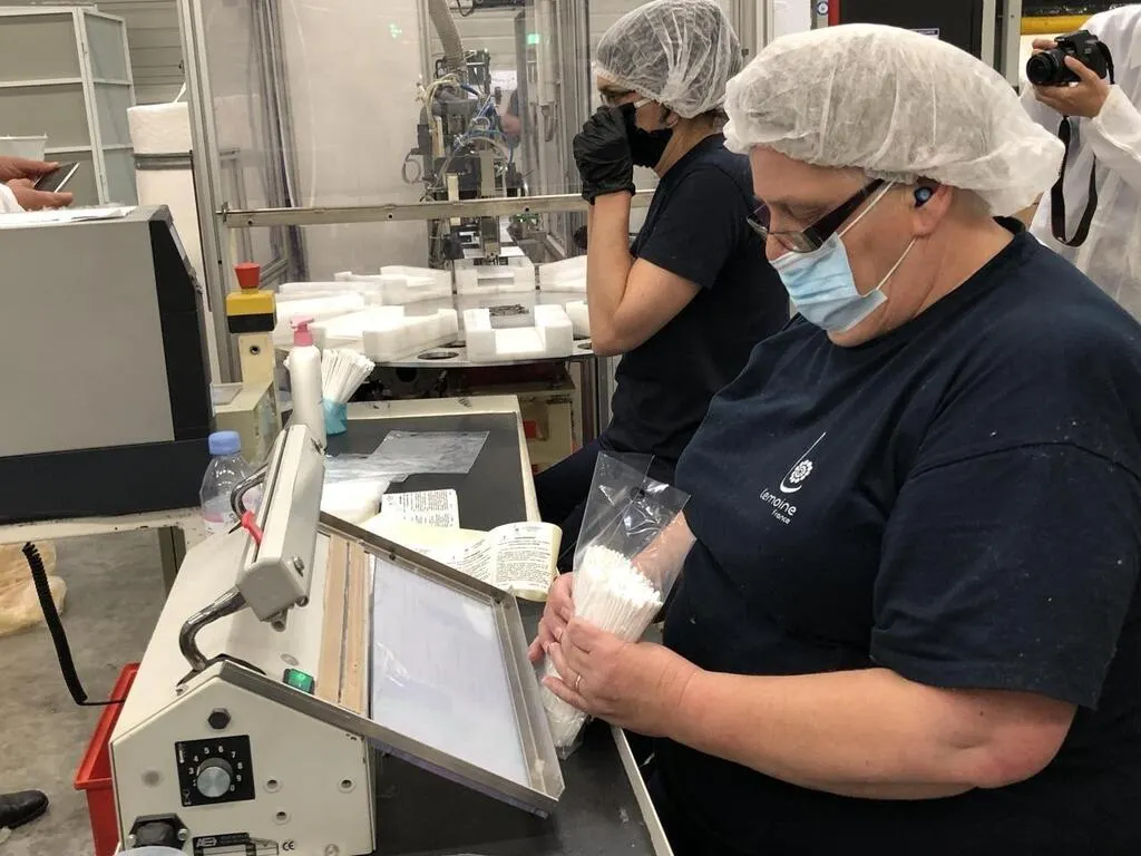 Le groupe familial Lemoine, leader européen des produits de soin et d’hygiène à base de coton – dont le bâtonnet ouaté – a lancé sa production d’écouvillons dès le 24 avril 2020. Cette petite brosse très fine est utilisée pour prélever des cellules nasales des personnes effectuant les tests PCR permettant de détecter le Covid-19. En juin, 200 000 écouvillons sortaient chaque jour de la chaîne qui leur est dédiée au sein des locaux basés à Caligny, près de Flers. C’est la seule entreprise française qui fabrique ces précieux écouvillons. Au plus fort de la crise sanitaire, cette société a employé 600 salariés et livré en métropole et Outre-mer. À partir de novembre, le groupe Lemoine a pu commencer à exporter ses écouvillons dans l’Union européenne.