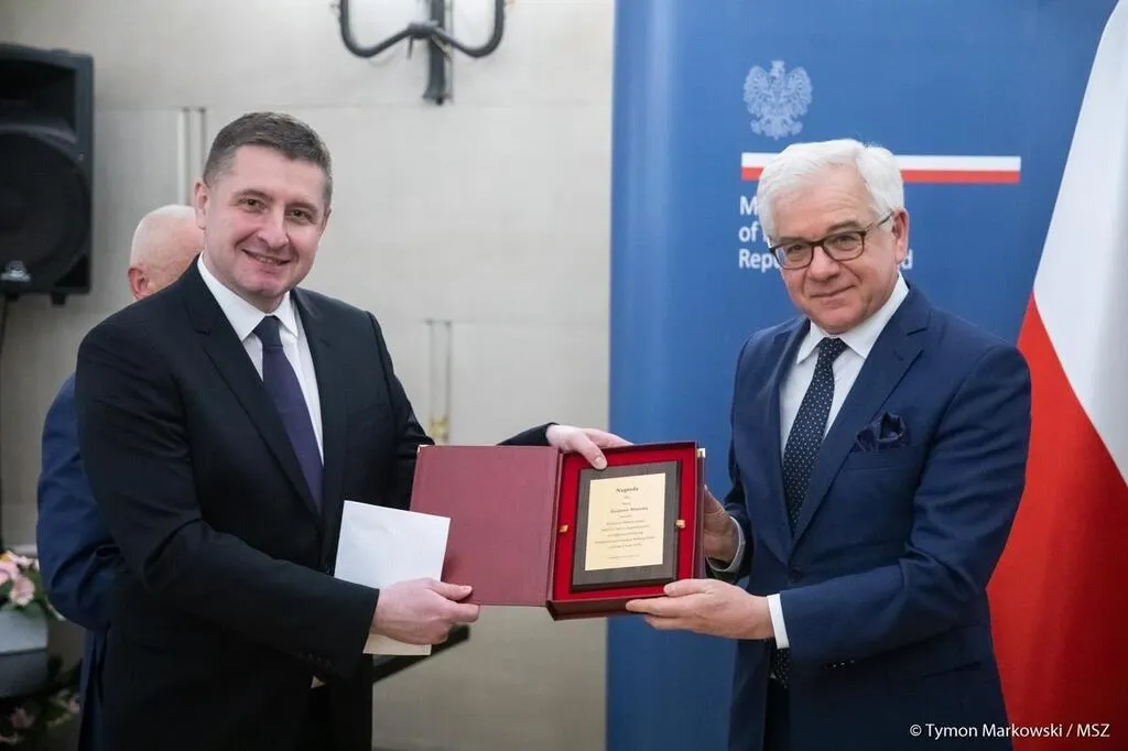 L’auteur Jacques Wiacek (à gauche) a reçu le prix de la meilleure publication en langue étrangère sur l’histoire de la Pologne des mains du ministre polonais des Affaires étrangères, Jacek Czaputowicz (photo prise en Pologne, début mars, avant les restrictions liées à la pandémie de coronavirus). © Ministère des Affaires étrangères polonais