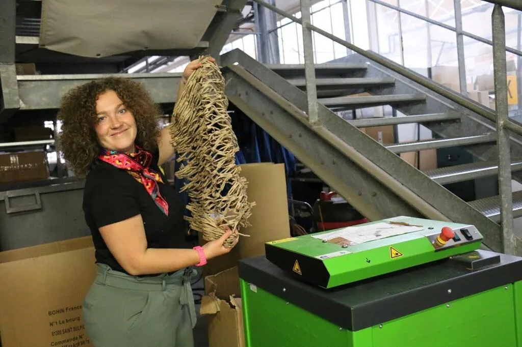 Audrey Régnier, directrice générale de la manufacture Bohin, a investi dans une machine qui permet de transformer les cartons utilisés en bourre colis. © Ouest-France