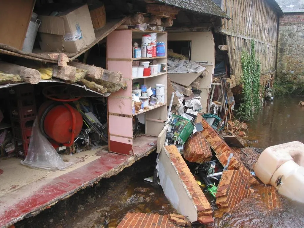 Effondrement d’un mur près du ruisseau devenu un torrent, à Sap-en-Auge (Orne). © Ouest-France