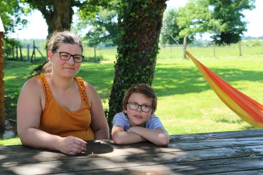 Céline Bouton et son fils Esteban dans leur jardin à Ciral. © Ouest-France