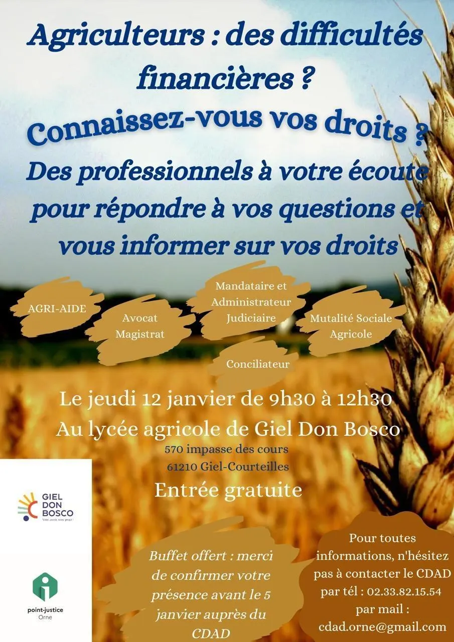 Le Conseil départemental de l’accès au droit de l’Orne invite des professionnels de la justice et du monde agricole au lycée Giel Don Bosco, jeudi 12 janvier 2023. Un rendez-vous pour informer les agriculteurs sur leurs droits en cas de difficultés financières et répondre à leurs questions.