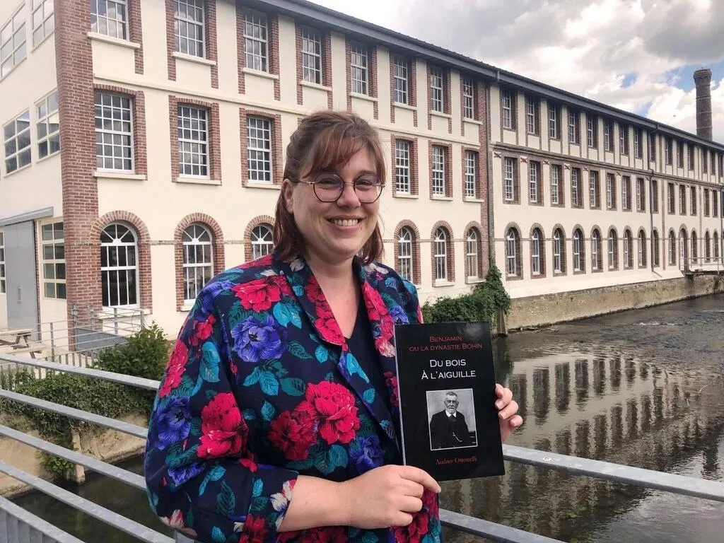 Audrey Ottonelli avec sa biographie de Benjamin Bohin, devant la manufacture à Saint-Sulpice-sur-Risle. © Ouest-France