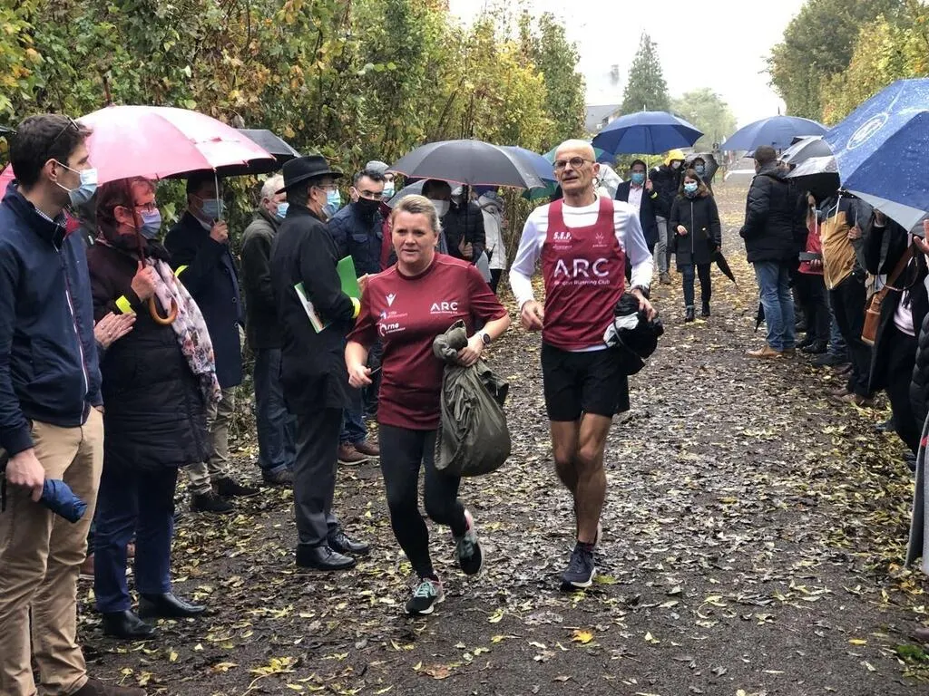 C’est sous une pluie battante, ce mardi 27 octobre 2020, à Damigny (Orne), que la nouvelle voie verte a été inaugurée. Des coureurs de l’association Alençon running club (Arc) et de l’Intrépide de Pré-en-Pail, en Mayenne, se sont rejoints sur le pont enjambant la Brillante, « une rencontre symbolique », souligne Jean-Marie, membre de l’Arc.