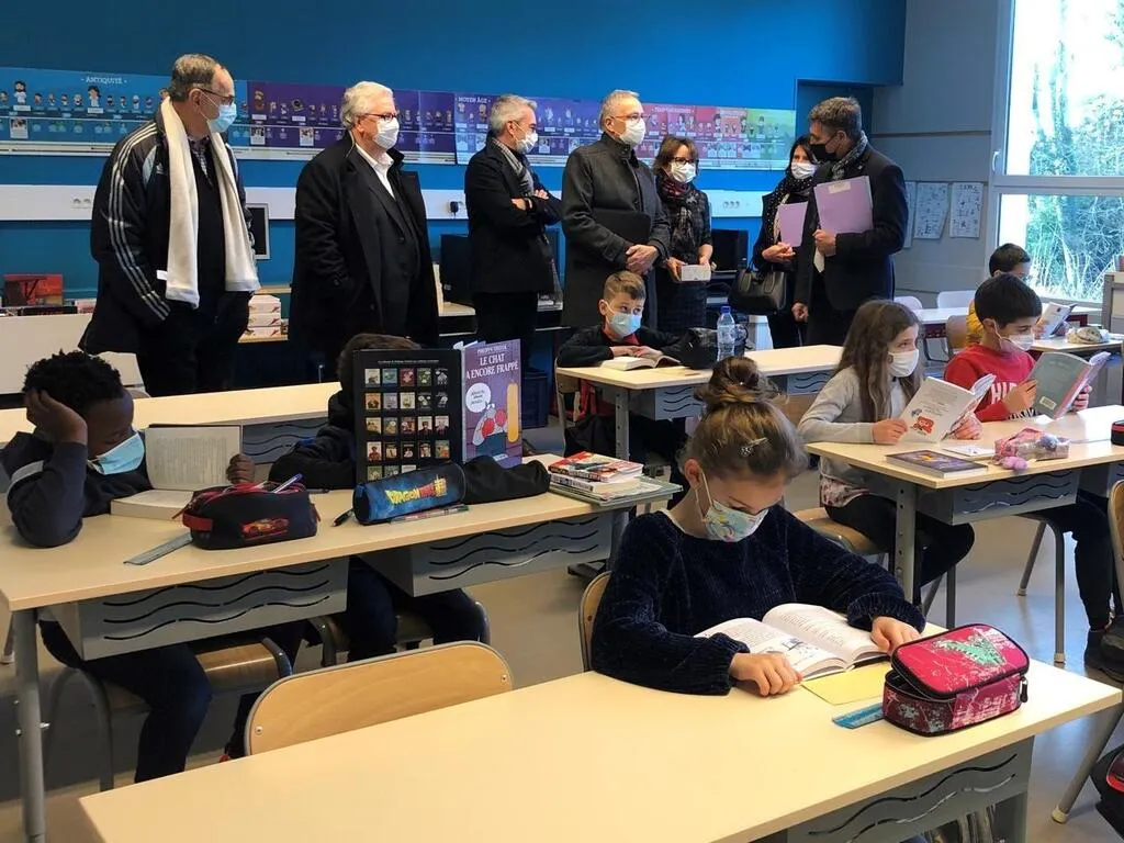 La visite a commencé pendant le quart d’heure consacré à la lecture. Les élèves de CM1-CM2 de la directrice Martine Morel sont plongés dans leurs livres tandis qu’élus et responsables de l’Éducation nationale conversent avec l’enseignante. © Ouest-France