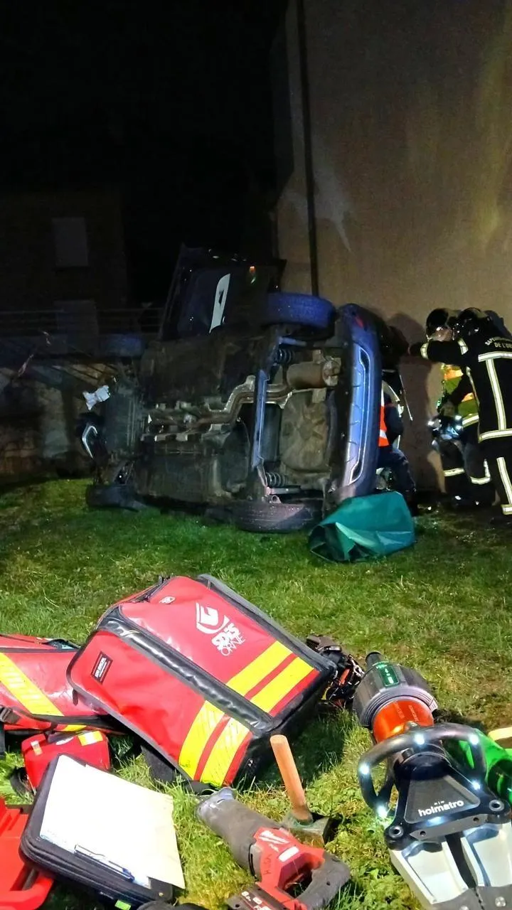 La voiture a été retrouvée sur le flanc par les policiers, avec quatre passagers à l’intérieur. Seul manquait le conducteur. Le prévenu se cachait derrière le véhicule. © Photo fournie par un témoin