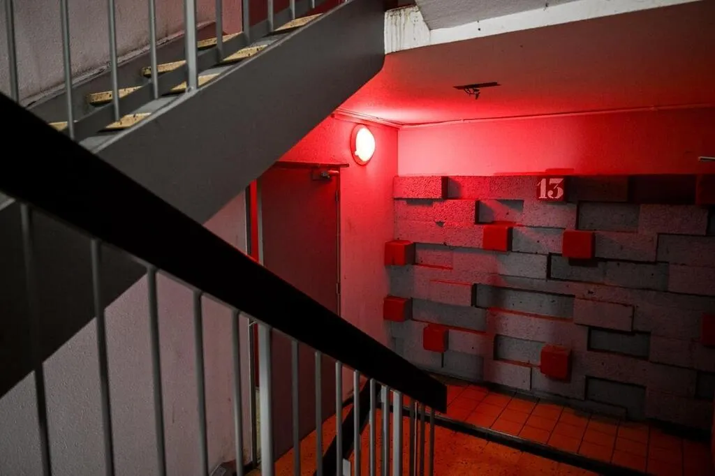 À l’intérieur de la tour Pascal, toutes les lumières ont été repeintes en rouge. Martin Roche / Ouest-France