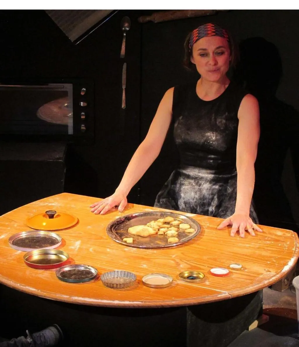 Le thème de ce spectacle ? Dans la chaleur d’une scène devenue cuisine, poussière de farine, boîte à sucre, rouleau, cuillères s’entrechoquent et rythment le temps du jeu, du souvenir, des sensations enfouies et de leurs chansons… Sons de casseroles, de bols, de couverts nous ouvrent la porte de cette cuisine et nous invitent au plaisir (interdit ?) de plonger les mains dans la farine, de vivre le voyage d’une boîte à sucre et de devenir l’acteur d’une réalisation culinaire…