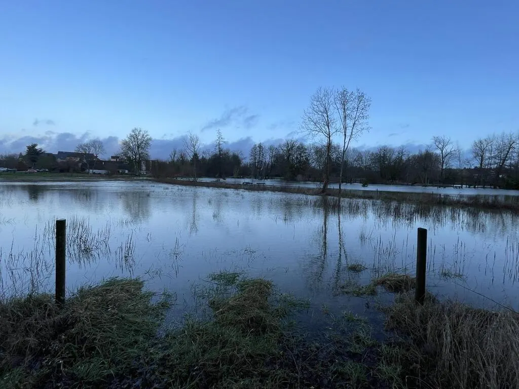 La Briante déborde, ce mercredi 3 janvier 2024. À Damigny (Orne), le parc situé en face de l’église est partiellement inondé. © Ouest-France