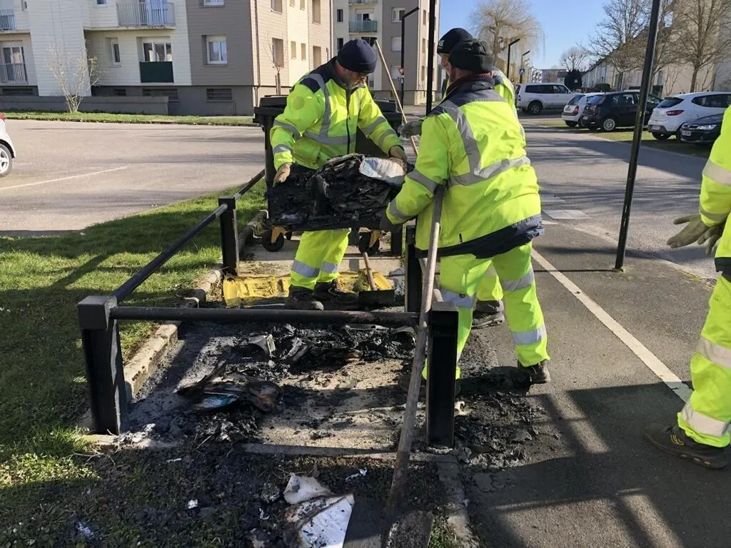Rue du Val-d’Orne, des agents communaux enlèvent les débris résultant de feux de poubelles. © Ouest-France
