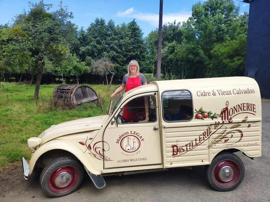 Isabelle Legay tient avec son mari et ses deux garçons la distillerie La Monnerie, à Cerisy-Belle-Étoile. À chaque visite, son arrivée en 2 CV ne passe pas inaperçue ! © OUEST-FRANCE