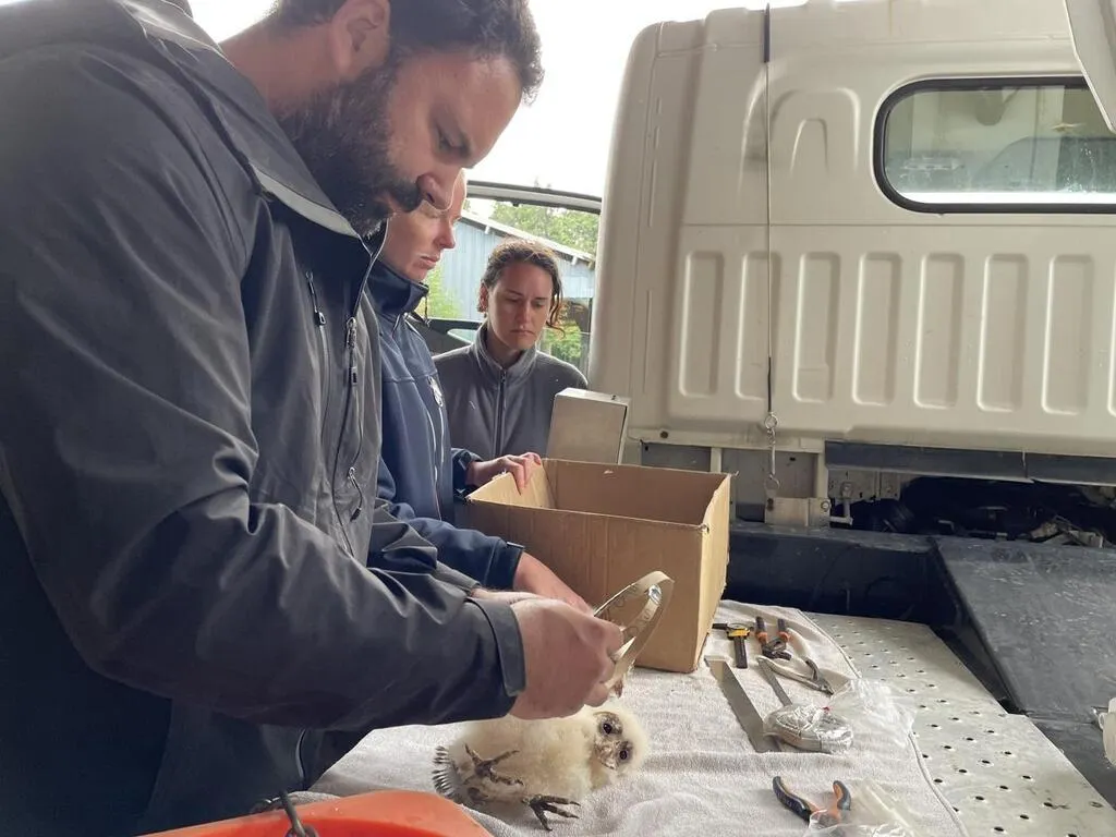Depuis 2022, Johann Launay, chargé de mission au Centre permanent d’initiatives pour l’environnement (CPIE) des collines normandes, installe des nichoirs dans les exploitations agricoles et bague les chouettes effraies pour un suivi scientifique.