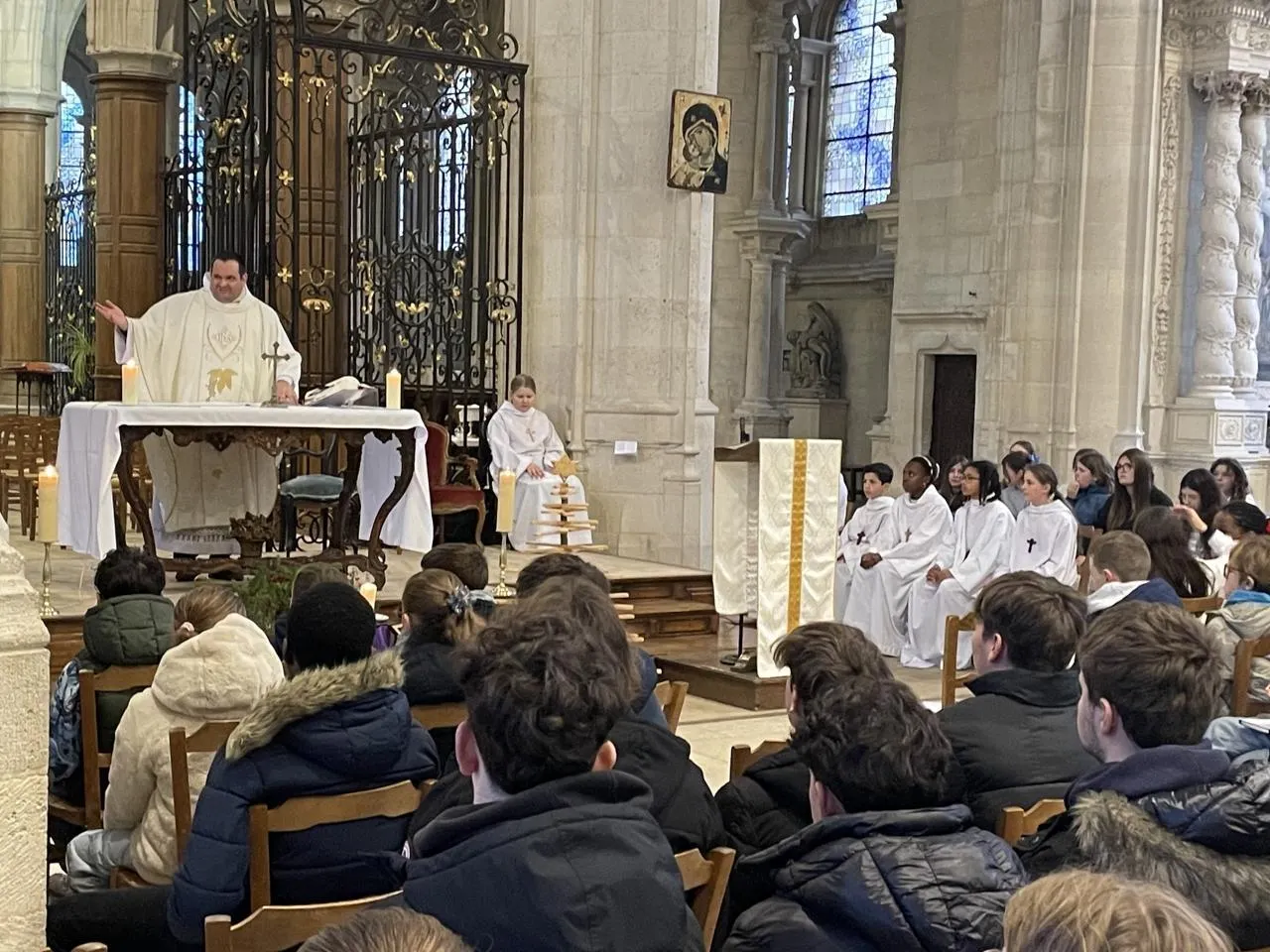 Vendredi 19 décembre, en début de matinée, le père Pierrick Harivel à la célébration de Noël pour l’établissement Jeanne-d’Arc. © Ouest-France